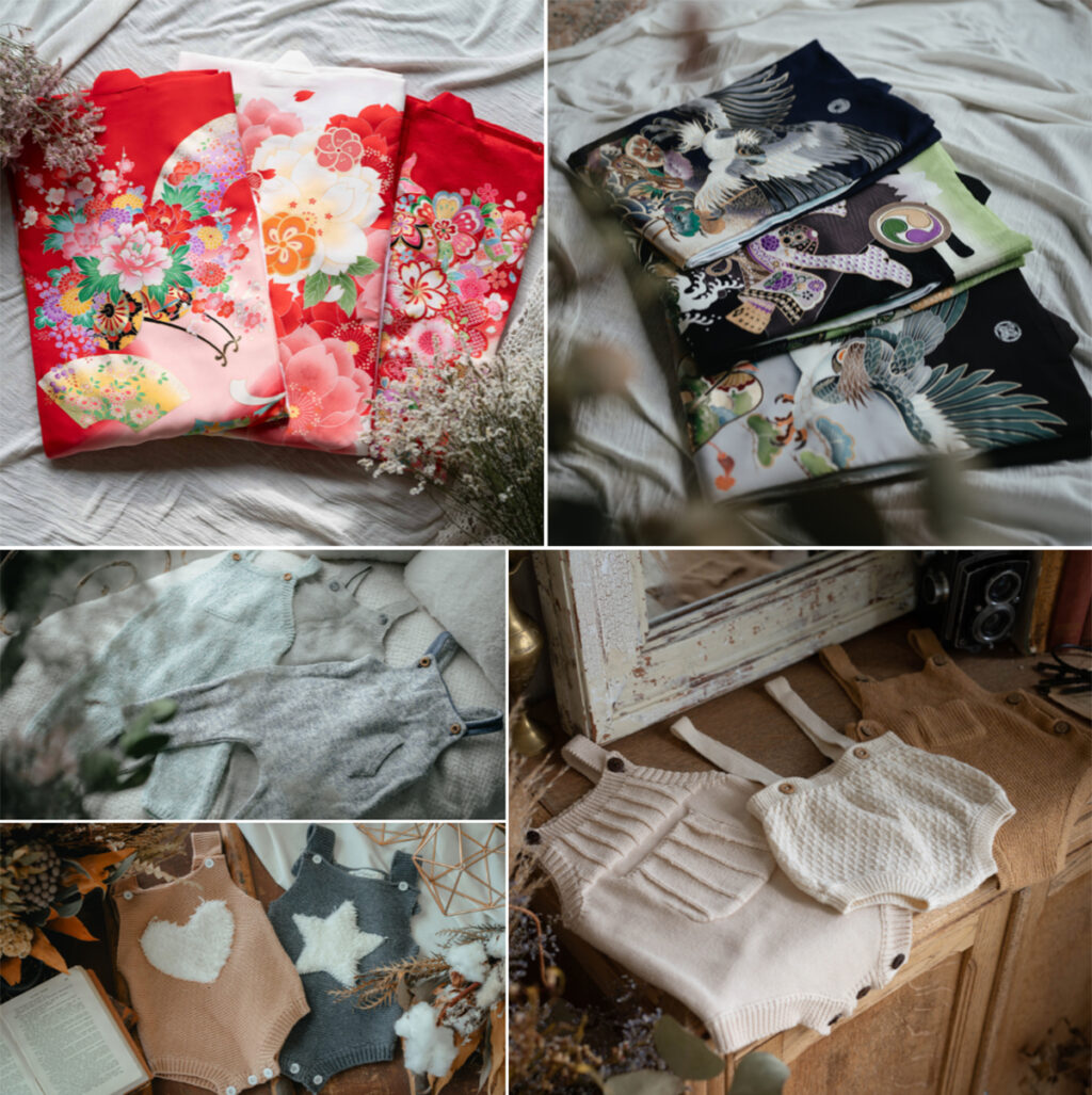 当店では撮影用のお衣装として産着、ニット、はだかんぼパンツをご用意しております。