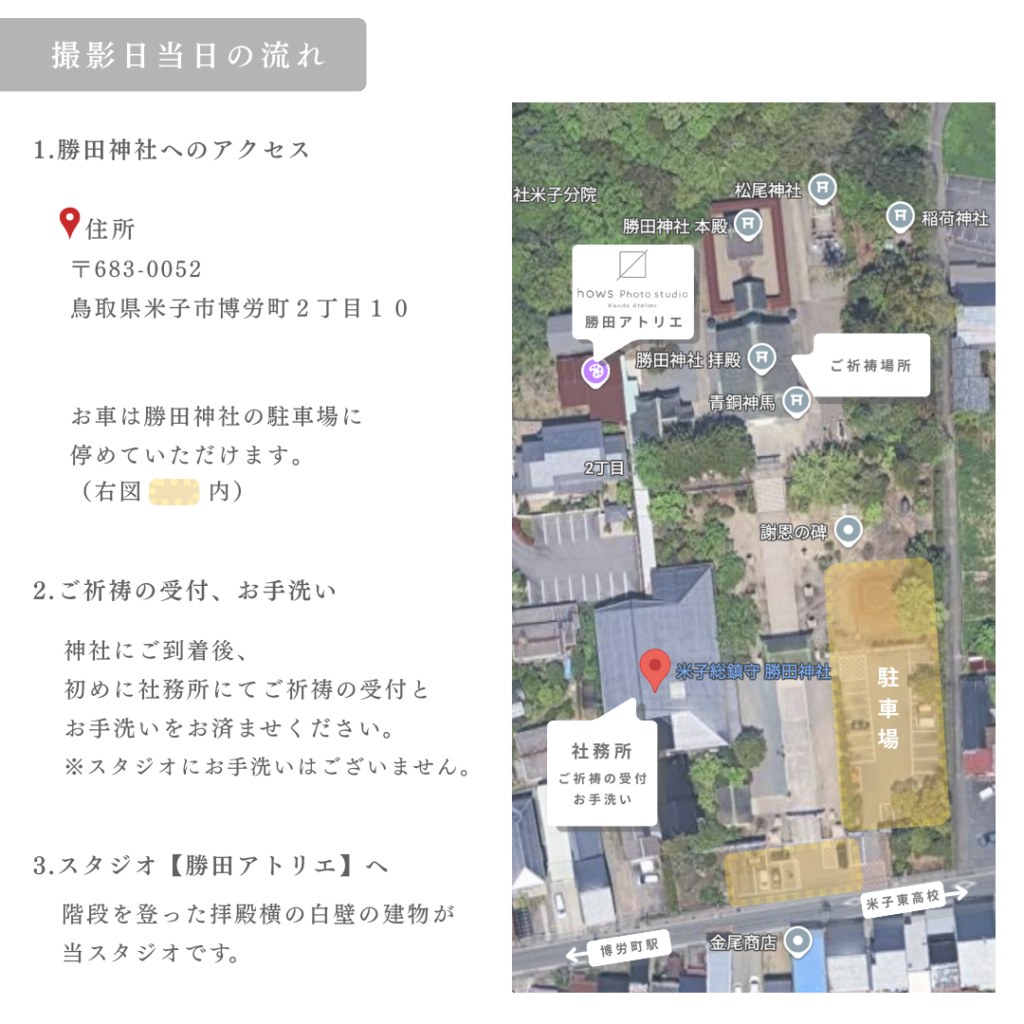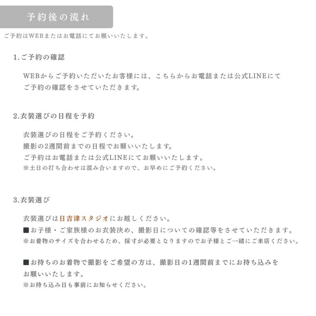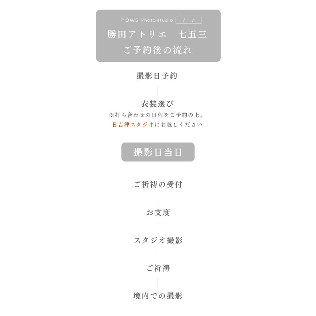 そこで今回は、勝田神社スタジオ(勝田アトリエ)で七五三撮影をご予定の方に向けて、撮影当日の流れをご紹介いたします。